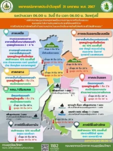 ในขณะที่มีลมใต้และลมตะวันออกเฉียงใต้พัดปกคลุมภาคเหนือตอนล่าง ภาคกลาง และภาคตะวันออก ทำให้บริเวณดังกล่าวมีฝนบางแห่ง ขอให้ประชาชนในบริเวณดังกล่าวดูแลรักษาสุขภาพเนื่องจากสภาพอากาศที่เปลี่ยนแปลง และระมัดระวังในการสัญจรผ่านบริเวณที่มีหมอกไว้ด้วย