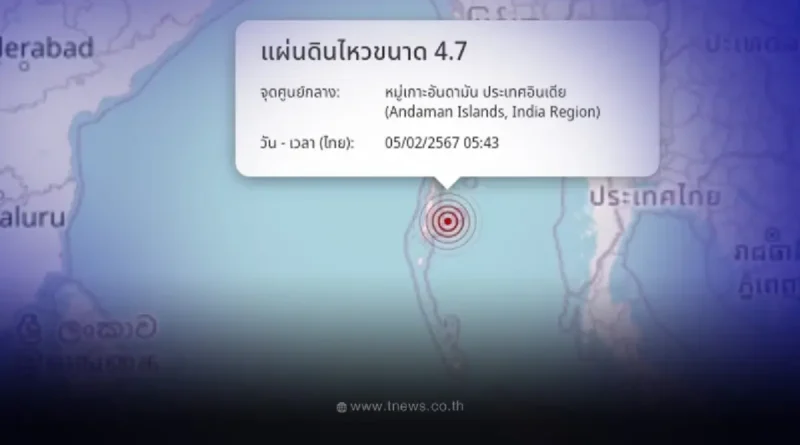 เมื่อเวลา 05.43 น. วันที่ 5 ก.พ. 2567 เกิดแผ่นดินไหวขนาด 4.7 แมกนิจูด ความลึก 144 กิโลเมตร บริเวณหมู่เกาะอันดามัน ประเทศอินเดีย จุดศูนย์กลางอยู่ห่างจากทิศตะวันตกเฉียงใต้ อ.ไทรโยค จ.กาญจนบุรี ประมาณ 655 กิโลเมตร รับรู้แรงสั่นสะเทือน