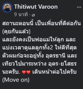 สถานะตอนนี้ เป็นเพื่อนที่ดีต่อกัน (คุยกันแล้ว)และยังคงเป็นพ่อแม่ให้ลูก และ แบ่งเวลาดูแลลูกทั้ง2 ให้ดีที่สุดตัวผมก้อจะอยู่ทั้ง อุดรธานี และเทียวไปมาระหว่าง อุดร-ยโสธร นะครับ. ❤️❤️ เดินหน้าต่อไปครับ (Move on)