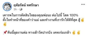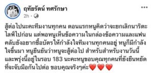 จากนั้น หมอลำคนเดิม ได้โพสต์อีกว่า “สู้ต่อไปนะคะทีมงานทุกคน ตอนแรกหนูคิดว่าจะยกเลิกนาริตะไลฟ์ไปก่อน แต่พอหนูเห็นข้อความในกล่องข้อความและแฟนคลับยังอยากซื้อบัตรให้กำลังใจทีมงานทุกคนอยู่ หนูก็มีกำลังใจขึ้นมา หนูยืนยันว่าหนูจะสู้ต่อไป สำหรับสำหรับงานวันนี้และพรุ่งนี้อยู่ในรอบ 183 นะคะ หนูขอบคุณทุกคนที่ยังยืนหยัดที่จะจับมือกันไปต่อ ขอบคุณจริงๆ ค่ะ”