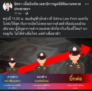 โดย ทนายตั้ม ได้แถลงข่าว พูดถึง 3นายตำรวจ พร้อมแฉเรื่องขบวนการส่วยตัวท็อปเดือนละมหาศาลสะเทือนสำนักงานตำรวจแห่งชาติ ที่เกี่ยวข้องกับ ตำรวจ คือ ดาบยาว คอมมานโด มีหน้าที่รวบรวม ส่งให้นาย , รองฟาง คนสนิท บิ๊กต่อ และ พล.ต.อ.ต่อศักดิ์ สุขวิมล ผบ.ตร. ซึ่งได้มีการส่งคนของตัวเองไปตำรวจไซเบอร์ เรื่องส่วยตั้งแต่ชั้นผู้น้อยไปจนถึงระดับผู้บังคับบัญชา มีเส้นเงินชัดเจน
