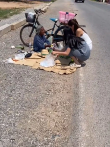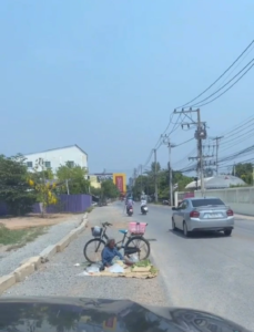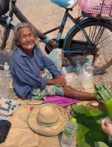 ซึ่งคุณยายใช้เพียงกระดาษปูกับพื้น และนั่งขายผักที่คาดว่า คือ ผักคะน้า บริเวณริมถนนที่ดูจากในคลิปคือเเดดร้อนมากๆ ไม่กางร่มหรือใส่หมวกกันแดด