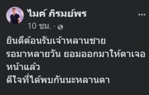 บอกเลยว่าคุณตาดีใจมากโดย ไมค์ภิรมย์พร ได้ออกมาโพสต์ภาพคู่กับหลานพร้อมระบุข้อความว่า ยินดีต้อนรับเจ้าหลานชาย รอมาหลายวัน ยอมออกมาให้ตาเจอหน้าแล้ว ดีใจที่ได้พบกันนะหลานตา