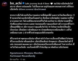เป็นการสูญเสียที่กระทันหันมาสำหรับการจากไปของอดีตนักแสดงหนุ่ม เบียร์ สรณัฐ โดยล่าสุดทางด้านโบ ชญาดา โพสต์อินสตราแกรมส่วนตัว @bo_achi ออกมาเผยข้อความถึงการจากไปในครั้งนี้ว่า “Safe journey krub R’Beer ขอให้อาเบียร์หลับให้สบาย เดินทางปลอดภัย ไปเป็นเทวดาอยู่กับคุณทวดบนสวรรค์ อชิรักอาเบียร์ครับ @beer.soranut @achirawat