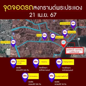 สำหรับจุดจอดรถยนต์ รองรับประชาชนที่จะเดินทางมาร่วมกิจกรรมสงกรานต์พระประแดง 2567 ให้จอดรถบริเวณดังกล่าว เพื่อเดินเท้ามาร่วมกิจกรรมสงกรานต์พระประแดง บริเวณแยกท่าน้ำพระประแดง ต.ตลาด จำนวน 5 จุด ดังนี้