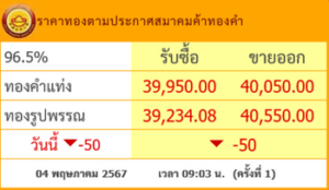 เมื่อวันที่ 4 พฤษภาคม 2567 สมาคมค้าทองคำรายงาน ราคาทองไทย ครั้งที่ 1 เมื่อเวลา 09:03 น. โดยราคาทองล่าสุดวันนี้นั้น เปิดตลาดเช้าราคาทองวันนี้ ทองคำ แท่ง รับซื้อบาทละ 39,950 ขายออกบาทละ 40,050 บาท ส่วนทองรูปพรรณ รับซื้อบาทละ 39,234.08 ขายออกบาทละ 40,550