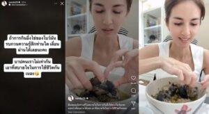 และโพสต์ไอจีสตอรี่ว่า “ถ้าการกินอึ่งไข่ของโบ์มันรบกวนความรู้สึกท่านใด เลื่อนผ่านได้เลยนะคะ