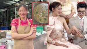 ซึ่งครั้งแรกฝ่ายชายยังออกมาทานที่ร้านแต่สั่งให้ไปส่งที่บ้าน เราก็ไม่ได้สนใจอะไร จนช่วงหนึ่งที่เค้ามาอุดหนุนที่ร้านแล้วก็แอบถ่ายเราเหมือนสต็อกเกอร์ ตอนแรกเราก็ตกใจว่าเขาเป็นใครจึงได้ทักไปเล่าให้เพื่อนฟังว่าชีวิตฉันไม่ปลอดภัย จนกระทั่งช่วงหนึ่งที่เราโสดอยู่ จึงมีโอกาสได้คุยกัน จากนั้นฝ่ายชายก็เริ่มมาทานราดหน้าร้านบ่อยขึ้น เราคุยกันประมาณสามถึงสี่เดือน เมื่อทุกอย่างเริ่มลงตัว ฝ่ายชายก็ไปคุยกับแม่แล้วขอมาอยู่ด้วย ก่อนที่จะมาช่วยงานที่เราทำอยู่ จนกระทั่งมาแต่งงานกันเมื่อปี 2023 ที่ผ่านมา