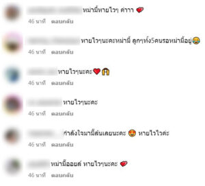 แฟนคลับเข้ามาส่งกำลังใจให้รัวๆเลยว่า หม่ามี้หายไวๆ ค่าาา , หายไวๆนะคะหม่ามี้ ลูกๆท้้ง5คนรอหม่ามี้อยู่ , หายไวๆนะคะ❤️ , หายไวๆนะคะ , กำลังใจมามี๊ล้นเลยนะคะ หายไวไวค่ะ