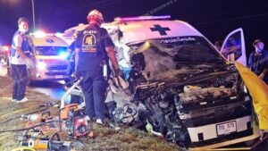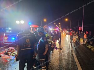 ฝนตกถนนลื่น รถตู้ครูชนรถฉุกเฉินรพ. เสียชีวิตคาที่ 1 ราย สาหัสอีก 4 ราย