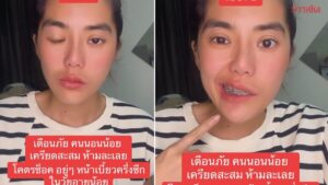โดยเธอระบข้อความว่า “เตือนภัยคนนอนน้อย เครียดสะสม ห้ามละเลย โคตรช็อก อยู่ๆ หน้าเบี้ยวครึ่งซีกในวัยอายุน้อย” ซึ่งเธอเล่าว่า วันนี้จะมาเล่าเหตุการณ์ที่เราเจออยู่ อันดับแรก เราจะรู้สึกว่าลิ้นชา กินอะไรก็ไม่เคยอร่อย มันจะชาแบบด้านๆ อาการเริ่มแรก ก่อนจะมีอาการปวดกกหูด้านขวาข้างหลัง จากนั้นเธอก็ลองกะพริบตาให้ดู ก็พบว่ากะพริบตาได้แค่ข้างเดียว ส่วนอีกข้างกะพริบไม่ได้