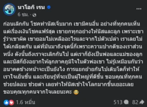 โดยนัสโพสต์ว่า ก่อนเลิกกัน โชคทำนัสเจ็บมาก เขามีคนอื่น อย่างที่ทุกคนเห็น แต่เรื่องเงินโชคแฟร์สุด เขายกทุกอย่างให้นัสและลูก เพราะเขารู้ว่าเขาผิด เขายอมไม่เหลืออะไรและจากไปตัวเปล่า