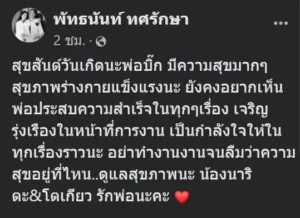 โดยระบุข้อความเอาไว้ว่า สุขสันต์วันเกิดนะพ่อบิ๊ก มีความสุขมากๆสุขภาพร่างกายแข็งแรงนะ ยังคงอยากเห็นพ่อประสบความสำเร็จในทุกๆเรื่อง เจริญรุ่งเรืองในหน้าที่การงาน เป็นกำลังใจให้ในทุกเรื่องราวนะ อย่าทำงานงานจนลืมว่าความสุขอยู่ที่ไหน..ดูแลสุขภาพนะ น้องนาริตะ&โตเกียว รักพ่อนะคะ ❤️