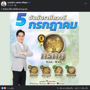 วันที่ 30 มิถุนายน 2567 เพจของหมอช้าง ที่ชื่อ หมอช้าง ทศพร ศรีตุลา ได้ออกมาโพสต์ 5 อันดับราศีที่ดวงดีที่สุดในเดือนกรกฎาคม โดยได้โพสต์ระบุข้อความว่า 5 อันดับราศีดวงดีเดือนกรกฎาคม