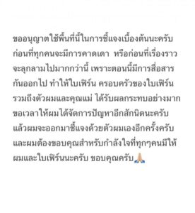 ขอเวลาให้ผมได้จัดการปัญหาอีกสักนิดนะครับ แล้วผมจะออกมาชี้แจงด้วยตัวผมเองอีกครั้งครับ และผมต้องขอบคุณสำหรับกำลังใจที่ทุกๆ คนมีให้ ผมและใบเฟิร์นนะครับ ขอบคุณครับ’
