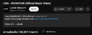 ปังไม่ไหว “ลิซ่า” ปล่อยเพลงใหม่ “ROCKSTAR” 2 ชั่วโมง ยอดวิวพุ่ง 2 ล้านกว่า