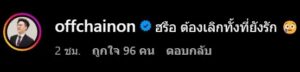 และในเวลาต่อมาทางด้าน ออฟ ชัยนนท์ ก็เข้ามา คอมเม้นต์ สั้นๆแต่บอกเลยว่าจุกมาก ระบุข้อความว่า ฮรือ ต้องเลิกทั้งที่ยังรัก
