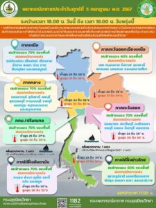 วันที่ 5 กรกฎาคม 2567 กรมอุตุนิยมวิทยา พยากรณ์อากาศ 24 ชั่วโมงข้างหน้า ร่องมรสุมพาดผ่านภาคเหนือและภาคตะวันออกเฉียงเหนือตอนบน เข้าสู่หย่อมความกดอากาศต่ำบริเวณประเทศเวียดนามตอนบนและอ่าวตังเกี๋ย ประกอบกับมรสุมตะวันตกเฉียงใต้ยังคงพัดปกคลุมทะเลอันดามัน ประเทศไทย และอ่าวไทย ลักษณะเช่นนี้ทำให้ประเทศไทยมีฝนตกหนักบางแห่ง ขอให้ประชาชนบริเวณดังกล่าวระวังอันตรายจากฝนตกหนักและฝนที่ตกสะสมซึ่งอาจทำให้เกิดน้ำท่วมฉับพลันและน้ำป่าไหลหลาก โดยเฉพาะพื้นที่ลาดเชิงเขาใกล้ทางน้ำไหลผ่านและพื้นที่ลุ่ม