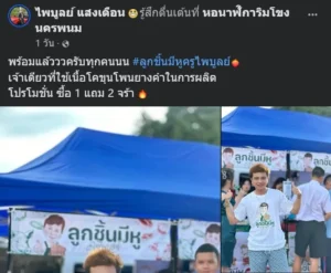 โดนครูไพบูลย์ได้เขียนข้อความเอาไว้ว่า พร้อมแล้วววครับทุกคนนน #ลูกชิ้นมีหูครูไพบูลย์ เจ้าเดียวที่ใช้เนื้อโคขุนโพนยางคำในการผลิต โปรโมชั่น ซื้อ 1 แถม 2 จร้า”