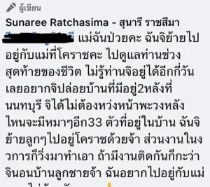 โดยเจ้าตัวได้มีการตอบคำถามจากแฟนคลับในคอมเม้นเอาไว้ว่า “แม่ฉันป่วยคะ ฉันจิย้ายไปอยู่กับแม่ที่โคราชคะ ไปดูแลท่านช่วงสุดท้ายของชีวิต ไม่รู้ท่านจิอยู่ได้อีกกี่วัน เลยอยากจิปล่อยบ้านที่มีอยู่ 2 หลังที่นนทบุรี จิได้ไม่ต้องห่วงหน้าพะวงหลัง ไหนจะมีหมาๆ อีก 33 ตัวที่อยู่ในบ้าน ฉันจิย้ายลูกๆ ไปอยู่โคราชด้วยจ้า ส่วนงานในวงการก็วิ่งมาทำเอา ถ้ามีงานติดกันก็กะว่าจินอนบ้านลูกชายจ้า ฉันอยากไปอยู่กับแม่แบบไม่ต้องกังวลคะ”