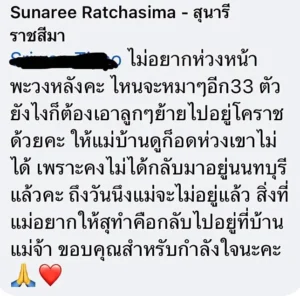และนอกจากนี้สุนารียังบอกอีกว่า “ไม่อยากห่วงหน้าพะวงหลังคะ ไหนจะหมาๆ อีก33 ตัว ยังไงก็ต้องเอาลูกๆ ย้ายไปอยู่โคราชด้วยคะ ให้แม่บ้านดูก็อดห่วงเขาไม่ได้ เพราะคงไม่ได้กลับมาอยู่นนทบุรีแล้วคะ ถึงวันนึงแม่จะไม่อยู่แล้ว สิ่งที่แม่อยากให้สุทำคือกลับไปอยู่ที่บ้านแม่จ้า ขอบคุณสำหรับกำลังใจนะคะ”