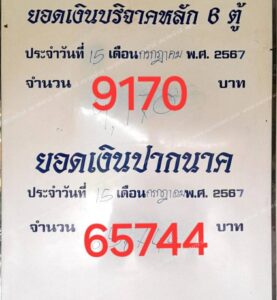 สำหรับตัวเลขยอดเงินปากนาคที่คณะกรรมการนับได้ช่วงเย็นของวันที่ 15 กรกฎาคม นี้ ยอดเงินจำนวน6 ตู้บริจาค นับได้ 9,170 บาท ส่วนยอดเงินปากนาค ยอดรวบนับได้ 65,744 บาทคนที่ยังไม่มีตัวเลขในใจก็สามารถนำไปเสี่ยงโชค ส่วนขันน้ำมนต์ที่ลานบวงสรวงหน้าเกาะคำชะโนดก็มีให้คอหวยได้ส่องถือว่าเป็นขันน้ำมนต์ขันสุดท้ายในวันนี้ ตามสายตาแต่ละคนจะมองเห็นน้ำตาเทียนเป็นตัวเลขต่างกันไปตามสายตาของคนชอบหวยเห็นน้ำตาเทียนเป็น 1-8-4 แล้วสายตาจะให้โชคถึงวันที่คนชอบเสี่ยงโชคต้องตัดสินใจแล้ว