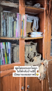 เมื่อดูไปที่พื้น ก็มีปลวกสีน้ำตาลเป็นทางยาวอยู่ที่พื้น แม้กระทั่งตู้หนังสือ หนังสือก็ไม่รอดจากการถูกปลวกแทะ จนสภาพเหมือนเป็นกระดาษที่ไร้ค่า