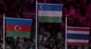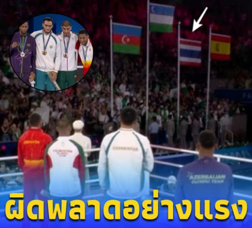 แต่ตอนที่เจ้าหน้าที่โอลิมปิก เปิดเพลงชาติของอุซเบกิสถาน และเชิญธงชาติทั้ง 4 ขึ้นสู่ยอดเสาตามธรรมเนียม ปรากฏว่าทีมงานดันหยิบธงชาติไทย มาใส่แทนธงชาติทาจิกิสถาน