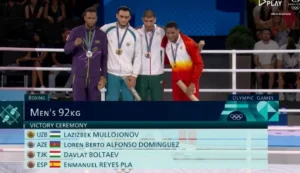 เรียกว่างงกันทั้งเวทีมอบเหรียญรางวัล มวยสากลสมัครเล่น โอลิมปิก 2024 รุ่น 92 กก. ชาย ที่มีนักมวย 4 คน ขึ้นเวทีไปรับเหรียญ ประกอบด้วยนักชกจาก อุซเบกิสถาน (เหรียญทอง), อาเซอร์ไบจาน (เหรียญเงิน) และ ทาจิกิสถาน กับ สเปน (เหรียญทองแดงคู่)