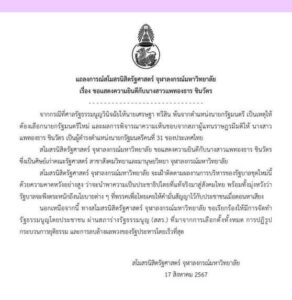 สโมสรนิสิตรัฐศาสตร์จุฬาลงกรณ์มหาวิทยาลัย ออกแถลงการณ์ แสดงความยินดี นางสาวแพทองธาร ชินวัตร ศิษย์เก่าคณะรัฐศาลตร์ สาขาสังคมวิทยาและมานุษยวิทยา จุฬาลงกรณ์มหาวิทยาลัย ได้รับเลือกเป็นนายกรัฐมนตรีคนที่ 31 ของประเทศไทย