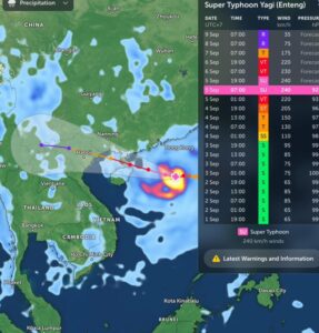 วันที่ 5 กันยายน 2567 เพจเฟซบุ๊ก World Forum ข่าวสารต่างประเทศ รายงานว่า พายุโซนร้อน ยางิ ทวีความรุนแรง เป็นซูเปอร์ไต้ฝุ่น ความเร็วลม 240 กม./ชม. JTWC คาดการณ์ ยางิ จะเป็นพายุระดับ 5 ขึ้นฝั่ง เวียดนาม จีน