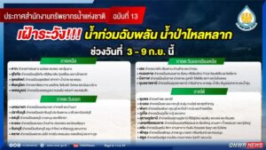 สำนักงานทรัพยากรน้ำแห่งชาติ ฉบับที่ 13/2567 เรื่อง เฝ้าระวังน้ำท่วมฉับพลัน น้ำป่าไหลหลาก โดยสำนักงานทรัพยากรน้ำแห่งชาติ (สทนช.) ได้ติดตามการคาดการณ์สภาพอากาศ พบว่าร่องมรสุมพาดผ่านภาคเหนือตอนล่าง ภาคกลาง และภาคตะวันออกเฉียงเหนือ ในขณะที่มรสุมตะวันตกเฉียงใต้มีกำลังแรงขึ้น ทำให้ประเทศไทยมีฝนตกหนักบางแห่งบริเวณภาคเหนือ ภาคตะวันออกเฉียงเหนือ ภาคตะวันออก และภาคใต้