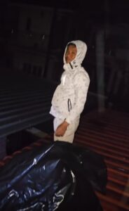 จากนั้นก็เผยภาพขณะพาครอบครัวหนีจากชั้นล่างของบ้าน ขึ้นไปอยู่บนชั้น 2 ด้วยการเจาะหลังคาและปีนขึ้นไปชั้นบน