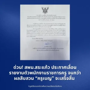 ด้วยปรากฏตามที่สำนักงานคณะกรรมการศึกษาขั้นพื้นฐานให้มีการแต่งตั้งคณะกรรมการสืบสวนข้อเท็จจริง ในกรณีการดำเนินการสรรหาและเลือกสรรเป็นพนักงานราชการทั่วไป ตำแหน่งครูผู้สอนสังกัดสำนักงานเขตพื้นที่การศึกษามัธยมศึกษาสระแก้ว เพื่อให้เป็นไปโดยความถูกต้องและเกิดความเป็นธรรมจึงให้เลื่อนกำหนดการรายงานตัวผู้ผ่านการสรรหาและเลือกสรรเป็นพนักงานราชการทั่วไป ตำแหน่งครูผู้สอน จำนวน 5 วิชาเอก