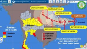 วันที่ 18 ก.ย. 2567 กรมอุตุนิยมวิทยา อัพเดทเส้นทางพายุดีเปรสชันบริเวณทะเลจีนใต้ตอนกลาง เช้าวันนี้ (18/9/67) พายุยังไม่แรงขึ้นเป็นโซนร้อน และเคลื่อนตัวช้าลงเล็กน้อย ไปทางทิศตะวันตก ด้วยความเร็วประมาณ 25 กม./ชม. มีแนวโน้มจะทวีกำลังแรงขึ้นเป็นพายุโซนร้อน และคาดว่าจะเคลื่อนขึ้นฝั่งบริเวณประเทศเวียดนามตอนกลางในช่วงวันที่ 20 – 21 ก.ย. 67 หลังจากนั้นจะอ่อนกำลังลงตามลำดับ และเคลื่อนเข้าปกคลุมบริเวณภาคอีสาน และภาคเหนือตอนล่าง