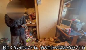 ต่อมา พนักงานทำความสะอาดได้จัดการห้อง 2 ห้องแรกเสร็จ พวกเขาก็ไปทำความสะอาดห้องญี่ปุ่นที่เคยเป็นที่พักของแม่ ซึ่งไม่มีใครเข้าไปนานถึง 10 ปี ภายในห้องนั้น นอกจากจะพบหนังสือพิมพ์เก่าและขนมหมดอายุแล้ว ยังพบสิ่งที่ดูเหมือนโครงกระดูกมนุษย์ในกองขยะ และยังเจอร่างที่ถูกห่อด้วยผ้าห่มอีกด้วย ในตอนแรกพนักงานฯ คิดว่าเป็นเพียงโมเดล แต่เมื่อเห็นร่องรอยของไขมันที่ละลายอยู่รอบ ๆ โครงกระดูก ก็ทำให้พวกเขาแน่ใจว่านี่คือซากศพแน่นอน