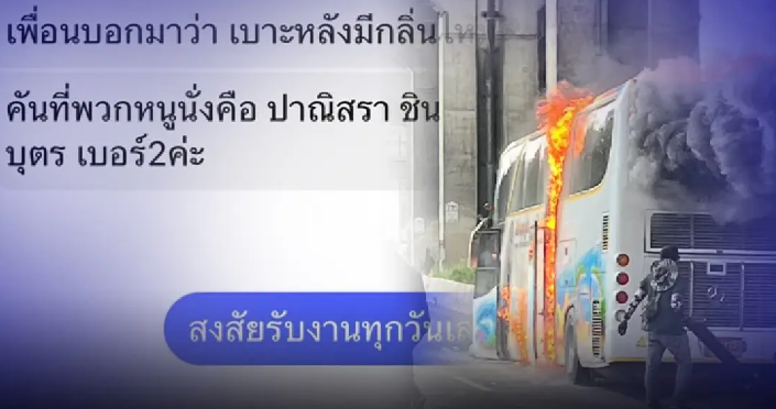 ล่าสุดเพจเฟซบุ๊ก อีซ้อขยี้ข่าว : อีซ้อ ได้เปิดเผยแชทข้อความนักเรียนรายหนึ่ง พร้อมระบุข้อความว่า “รถทัวร์ที่ไฟไหม้ เมื่อวานเพิ่งพาเด็กอีกโรงเรียนไปทัศนศึกษากลับตอนค่ำ ๆ พบว่ามีกลิ่นไหม้ตั้งแต่เมื่อวานแล้ว โดยในแชทเป็นนักเรียนคนหนึ่ง ที่ตอบปลายทางว่า ใช้รถทัวร์ของบริษัทดังกล่าวไปทัศนศึกษา แต่วันที่เธอไปฝนตก ทำให้รถอาจจะไม่ร้อนมากแต่ก็ได้กลิ่นไหม้จากรถ เธอยังระบุอีกว่า หนูยังเกือบไม่รอด ใจไม่ดีเลย”
