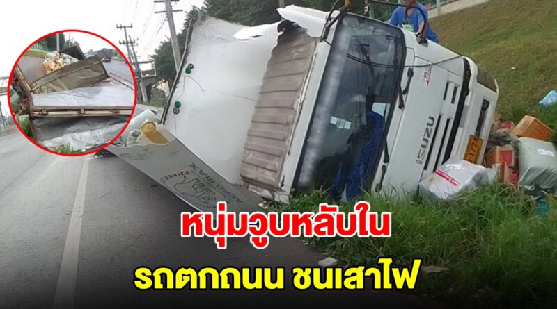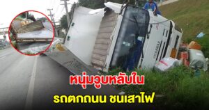 โดยที่เกิดเหตุพบรถ 10 ล้อตู้ทึบบรรทุกสินค้า ยี่ห้ออีซูซุ สีขาว กรุงเทพมหานคร พลิกตะแคงข้างอยู่ที่ร่องน้ำริมทางในสภาพพังยับ ในขณะที่สินค้าที่บรรทุกมาด้วย ทั้งที่แพคเป็นถุง เป็นกล่อง และสินค้าเบ็ดเตล็ดอื่นๆ หล่นกระจายเกลื่อนทั่วบริเวณ โดยสินค้าส่วนหนึ่งที่แพคใส่ถุงและบรรจุกล่อง ถูกตัวรถทับพังเสียหายด้วย
