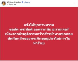 ส่าสุด พระมหาวัฒนา ได้โพสต์เฟซบุ๊ก Wattana Khamken ระบุข้อความว่า แจ้งให้ทุกท่านทราบ ขอตัด พระสันติ ออกจากทีม อะเวนเจอร์ เนื่องจากมีพฤติกรรมกร้าวร้าวท้าทายชกต่อย ขัดกับหลักของพระภิกษุอนูปฆาโต (การไม่ทำร้าย)