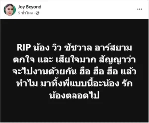 ทางด้านนักร้องสาว “จอย บียอนด์” เคลื่อนไหวผ่านเฟซบุ๊กส่วนตัว หลังทราบข่าว วิว ชัชวาล เสียชีวิต ระบุว่า “RIP น้องวิว ชัชวาล อาร์สยาม ตกใจ และ เสียใจมาก สัญญาว่าจะไปงานด้วยกัน ฮือ ฮือ ฮือ แล้วทำไม มาทิ้งพี่แบบนี้อะน้อง รักน้องตลอดไป”