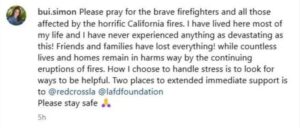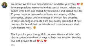 ซึ่ง ปุ๋ย ภรณ์ทิพย์ ได้เผยผ่านไอจีส่วนตัวของเธอด้วยว่า “เมื่อวานนี้เราสูญเสียบ้านอันเป็นที่รักในมาลิบู ความทรงจำอันล้ำค่ามากมายในบ้านพิเศษหลังนั้น… ที่ซึ่งลูกๆ ของฉันเกิดและเติบโต บ้านหลังแรก และรังศักดิ์สิทธิ์ของฉันตลอด 25 ปี ตอนนี้กลายเป็นเถ้าถ่าน… ทุกอย่างถูกลบไปหมด ทั้งข้าวของ รูปถ่าย และของที่ระลึกทั้งหมดในช่วงสองสามทศวรรษที่ผ่านมา