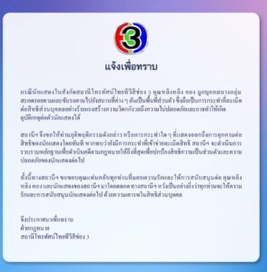 ไม่ทน ช่อง 3 ประกาศร่อนแถลงการณ์ 3 ภาษา