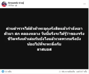 โดย กัน จอมพลัง ได้โพสต์ถึงกรณีจับกุม ต้า โอริโอ้ เอาไว้ว่า “ด่วนตำรวจได้ตัวต้าทะลุถุงรังสิตแล้วกำลังเอาตัวมา สภ คลองหลวง วันนี้มรึงจะได้รู้ว่าของจริงชีวิตจริงเค้าเล่นกันยังไงแล้วเวลพวกมรึงยังน้อยไปที่จะทะลึ่งกับลาสบอส”