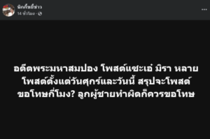 ต่อมายังได้ระบุต่ออีกว่า อดีตพระมหาสมปอง โพสต์แซะเอ๋ มิรา หลายโพสต์ตั้งแต่วันศุกร์และวันนี้ สรุปจะโพสต์ขอโทษกี่โมง? ลูกผู้ชายทำผิดก็ควรขอโทษ