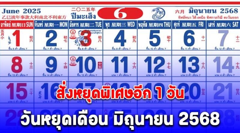 ครม. สั่งหยุดพิเศษอีก 1 วัน ประกาศแล้ว วันหยุดเดือน มิถุนายน 2568
