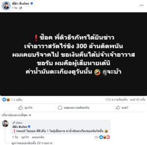 พร้อมกับคอมเมนต์เพิ่มเติมอีกว่า “❗️กดแชร์ ไม่ยอม พี่ดิวคือ 1 ในผู้เสียหาย ค่าน้ำมันตะเกียงของฉันวันนั้น 🤣”