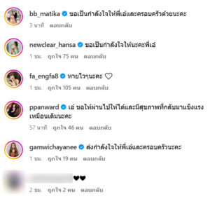 คนบันเทิงส่งกำลังใจรัวๆเลยว่า ขอเป็นกำลังใจให้พี่เอ๋และครอบครัวด้วยนะคะ , ขอเป็นกำลังใจให้นะคะพี่เอ๋ , หายไวๆนะคะ 🤍 , เอ๋ ขอให้ผ่านไปให้ได้และมีสุขภาพที่กลับมาแข็งแรงเหมือนเดิมนะคะ , ส่งกำลังใจให้พี่เอ๋และครอบครัวนะคะ