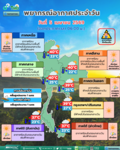 วันที่ 5 เมษายน 2569 กรมอุตุนิยมวิทยา พยากรณ์อากาศ 24 ชั่วโมงข้างหน้า ประเทศไทยตอนบนมีอากาศร้อนโดยทั่วไปและมีอากาศร้อนจัดบางพื้นที่ กับมีฟ้าหลัวในตอนกลางวัน ส่วนภาคใต้มีอากาศร้อน เนื่องจากความกดอากาศต่ำเนื่องจากความร้อนปกคลุมประเทศไทยตอนบน ในขณะที่มีลมใต้และลมตะวันตกเฉียงใต้กำลังอ่อนพัดปกคลุมในบริเวณดังกล่าว ทำให้ประเทศไทยมีฝนน้อย ขอให้ประชาชน ดูแลรักษาสุขภาพเนื่องจากสภาพอากาศที่ร้อนถึงร้อนจัด โดยหลีกเลี่ยงการทำงานหรือการประกอบกิจกรรมในที่โล่งแจ้งเป็นระยะเวลานาน รวมทั้งระวังอันตรายจากฝนฟ้าคะนองที่อาจเกิดขึ้นได้บางพื้นที่ไว้ด้วย