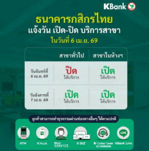 จากกรณี ธนาคารกสิกร ได้ออกมาประกาศเตือนลูกค้าทุกคนโดยระบุว่า ธนาคารกสิกรไทย แจ้งวันทำการสาขาในช่วงวันหยุด เนื่องในวันสมเด็จพระพุทธยอดฟ้าจุฬาโลกมหาราช และ วันที่ระลึกมหาจักรีบรมราชวงศ์ วันที่ 6 เมษายน 2569