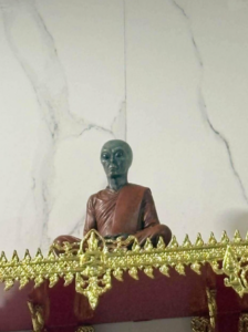 แต่เมื่อสังเกตใกล้ ๆ กลับพบความผิดปกติ เพราะรูปปั้นดังกล่าวไม่ได้เป็นพระพุทธรูปอย่างที่คิด หากแต่เป็น “เอเลี่ยน” ที่ถูกตกแต่งให้สวมจีวรแทน แถมยังมีการติดข้อความอวยพรไว้ด้านล่างอย่างจริงจัง